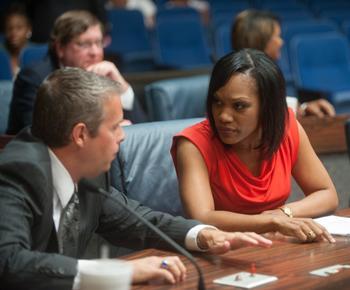 Photo: http://isuphoto.smugmug.com/Other/Media-Services/Maggie-Lewis-Indianapolis-City/i-p7J6rXL/0/L/06_25_12_maggie_lewis-3732-L.jpg - Steve Talley is among Indianapolis City-County Council President and Indiana State University alumna Maggie Lewis\' colleagues on the council. (ISU/Tony Campbell)