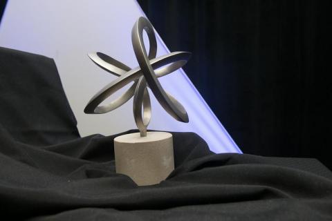 Photo: http://isuphoto.smugmug.com/Other/Media-Services/Media-Miscellaneous/March-On-Awards/i-LTCCpJs/0/L/July%2026%2C%202014%20March%20On%202171-L.jpg - \"Sycamore Cycle,\" the Indiana State University Foundation\'s March On! Award, is a commissioned artwork designed to represent philanthropy to Indiana State University and the impact donors have on students and the university. A full size version of the work by Roger Barry of Clarksburg, Calif., is expected to be added to the campus outdoor sculpture collection.