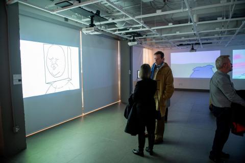 Photos: https://photos.smugmug.com/photos/i-pHWXnW8/0/X3/i-pHWXnW8-X3.jpg -- ISU Vice President for Student Affairs Andy Morgan and College of Health and Human Services Dean Caroline Mallory talk as they tour the digital art exhibit in Turman Gallery during the rededication of the Fine Arts and Commerce Building on Tuesday.